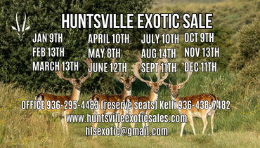 Welcome to Huntsville Exotic Sales, a trusted name in exotic animal sales . Dealing mainly with alternative livestock sales and auctions, Huntsville Exotic offers a wide variety of exotics, including red deer, fallow, Sika, elk, axis, rams, goats, sheep and Indian and African game animals.